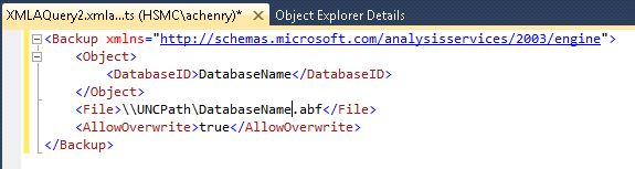 - You should now have an XMLAQuery window in SSMS that contains the commands to back up your database.